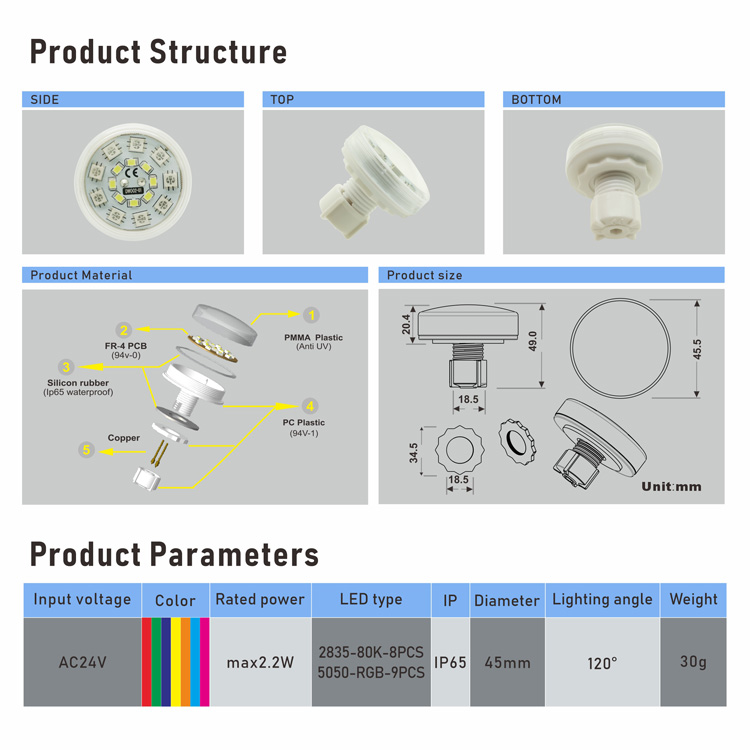 2.高品质结构:直径45毫米,,,内置8x2835W和9x5050 RGB高亮度LED,,,240度照明。。。。 。