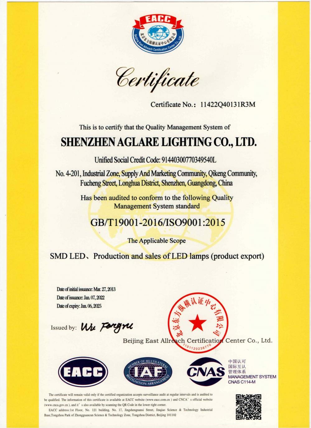 深圳市bm11222宝马娱乐网站光电有限公司是一个灯具产品工贸一体的企业,,,,,,,以是我们知道一个好品质的品牌对一个公司的作用,,,,,,,公司从2012年最先就凭证ISO 的生产管控流程安排公司的所有生产活动,,,,,,,严酷控制公司的产品质量,,,,,,,在2021年12月28号通过了ISO 指准时机的年审,,,,,,,并在今天2021年1月12日取得了ISO 公司签发的2022年的ISO 认证证书。。。。我司会一直以产品品质为优先条件,,,,,,,生产出好的LED灯具产品,,,,,,,让AGLARE这个品牌在全球灯具市场上更有影响力。。。。
