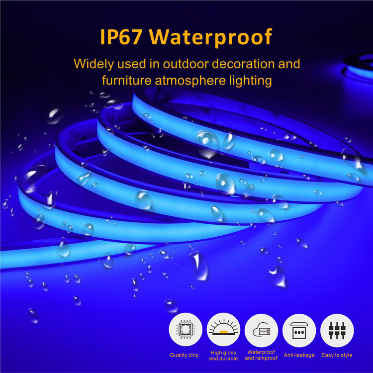 问:我可以将这些 COB LED 灯带用于户外应用吗??????答:是的,,,,,,绝对!蓝色 COB 软灯带专为户外使用而设计。。。。。。。其柔软的硅胶管盖将 IP 品级提高到 IP67,,,,,,使其具有高度防水和防尘功效。。。。。。。